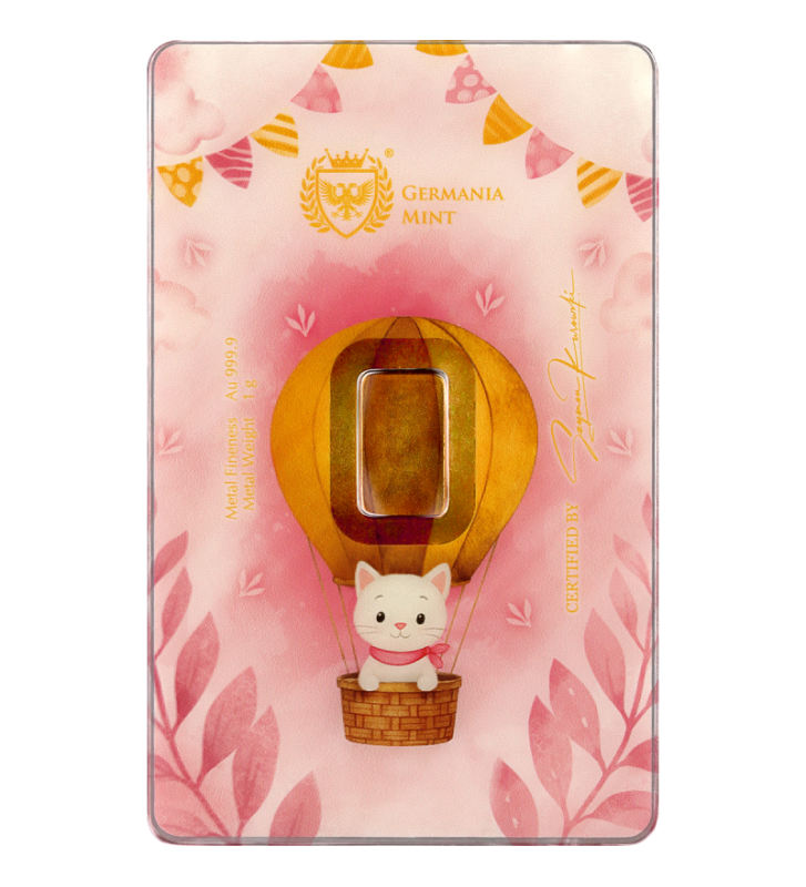 Germania Mint Gold Minted Bar 1 g – New Born – Girl – a gold bar made of 999.9 fine gold, packaged in a Safepack specially designed for a baby girl.