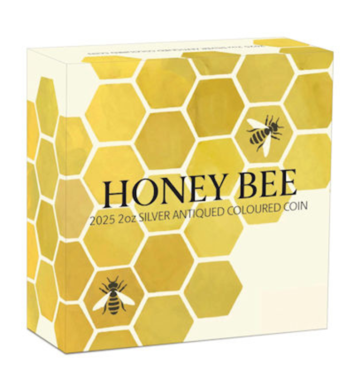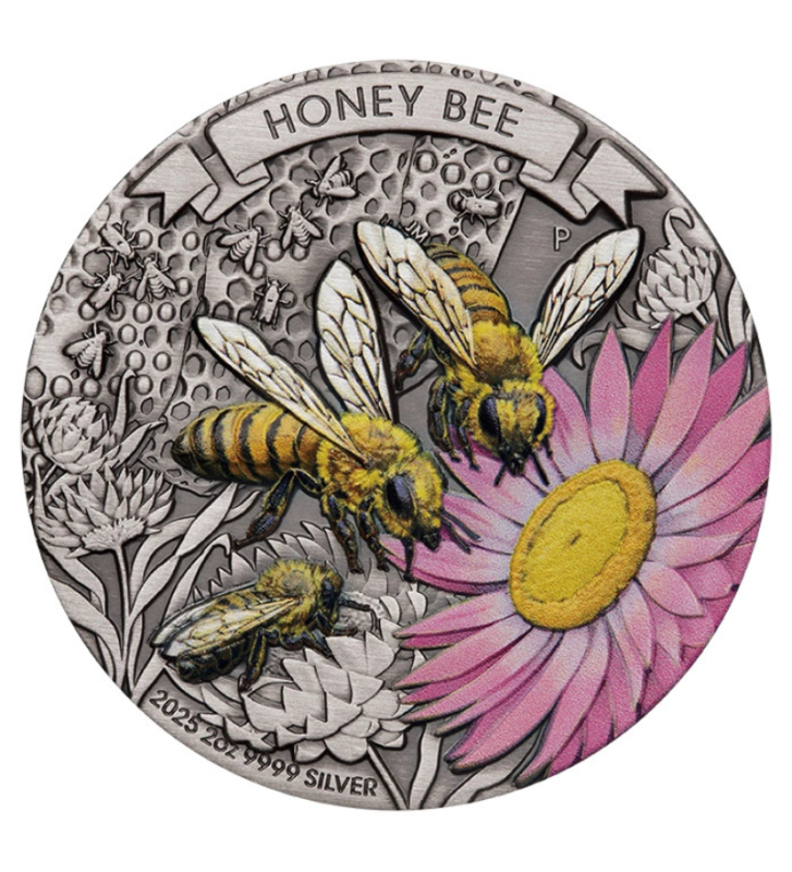 Honey Bee Colored 2 oz Silver 2025 Antiqued Coin is a unique silver coin that celebrates one of the most important and hardworking creatures in nature – the honeybee (Apis mellifera). The species name comes from Latin, where “Apis” means bee and “mellifera” means “honey-bearing.” This extraordinary insect plays a key role not only in honey production but also in pollinating plants, making it an invaluable part of ecological balance and agriculture worldwide.