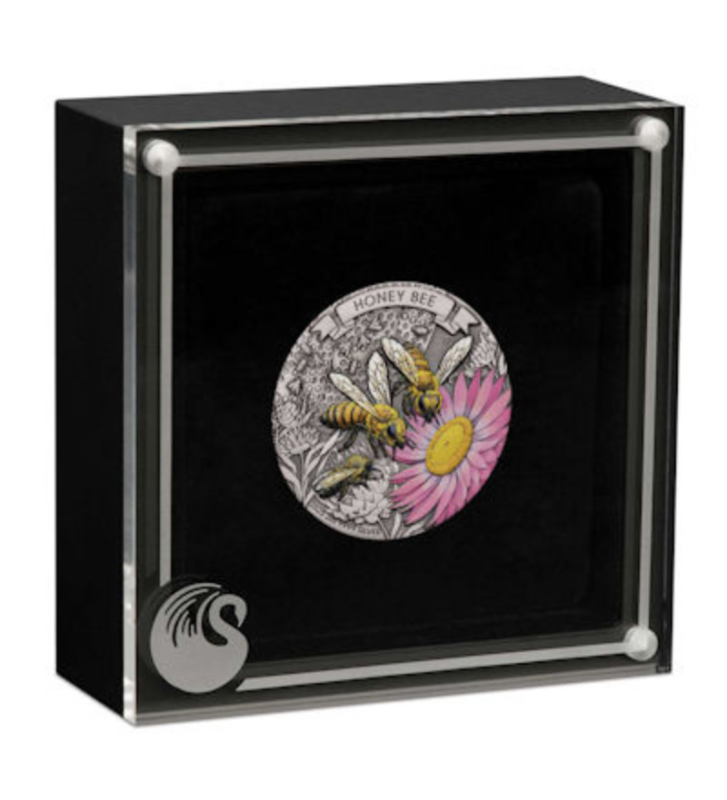 Reverse: features two colorful honeybee workers resting on the petals of a vibrant pink daisy with a yellow center. The background is enriched with additional graphics of bees gathering nectar from honeycombs and flowers, creating a lively and naturalistic scene. The reverse also includes a ribbon with the inscription “HONEY BEE,” the year 2025, weight and purity of the silver, and the Perth Mint hallmark (“P”). The design is by Jennifer McKenna.