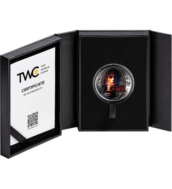 This 1 oz proof-quality silver coin unveils her spectral presence with vivid digital printing, every feature rendered with haunting precision. The mirror-like design pulls you into her domain, blurring the line between legend and reality.