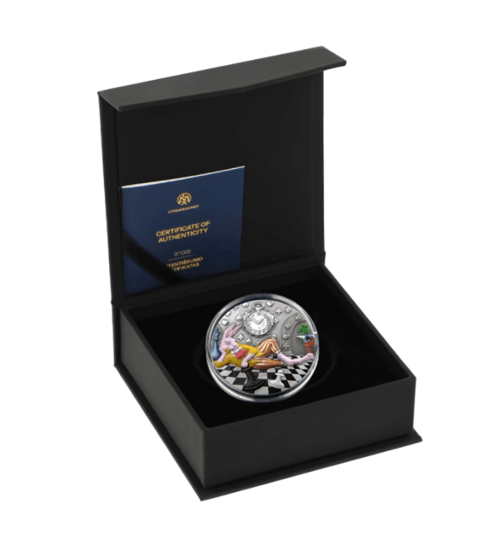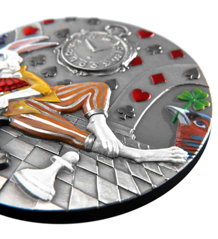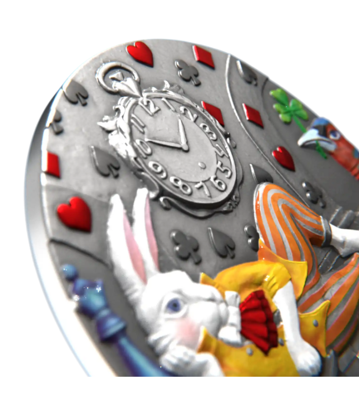 Made from one ounce of pure silver, this limited-edition collector coin brings to life a surreal and symbol-rich scene. At its center lies a white rabbit — a timeless symbol of curiosity and time — resting on a checkered floor. The scene is intricate and evocative, drawing the viewer into a moment suspended between play and contemplation.