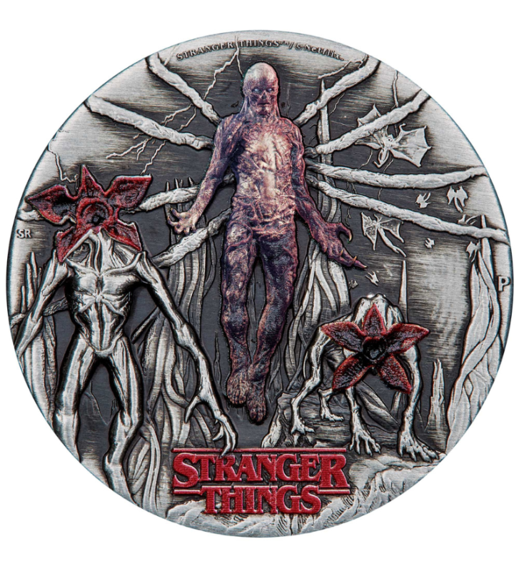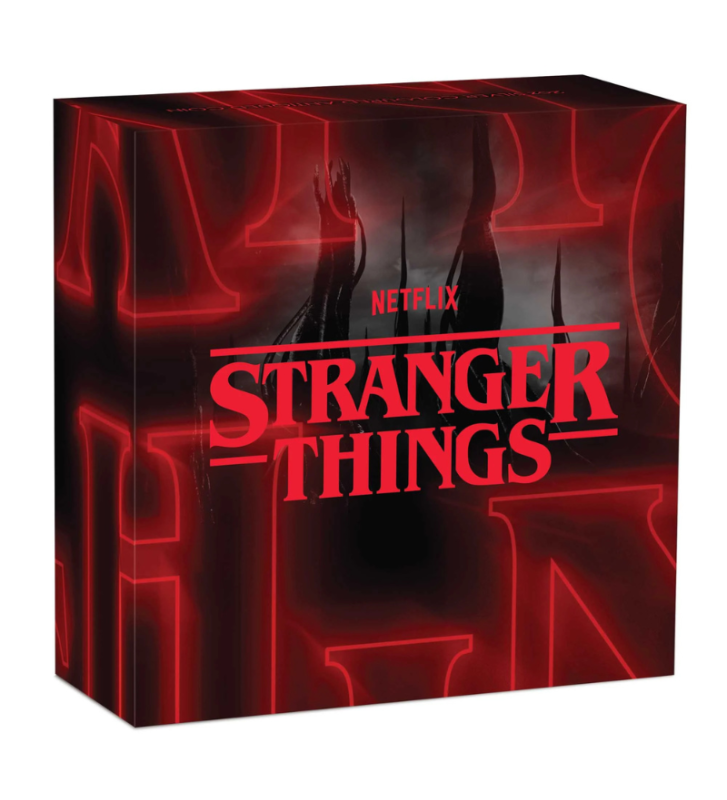 The coin is housed in a black wooden case with red accents. The lid is decorated with embossed detailing and features the official Netflix and Stranger Things logos. Packaged in a themed shipper, the release comes with a numbered Certificate of Authenticity.