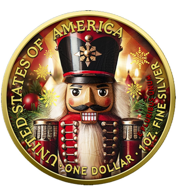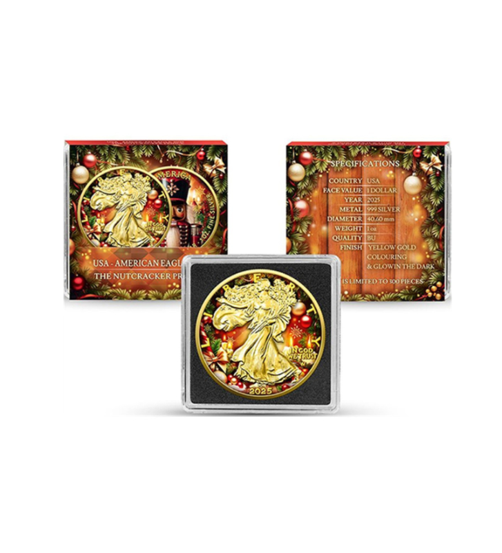 This classic, globally recognized silver coin has been given a delightful new holiday twist with two festive designs: the Nutcracker and the Elf. The double-sided coloring brings warmth and cheerful character to each piece, while the gold-plated obverse and Glow-in-the-Dark effect make these coins literally light up the winter nights, transforming them into both collectible treasures and charming seasonal decorations.