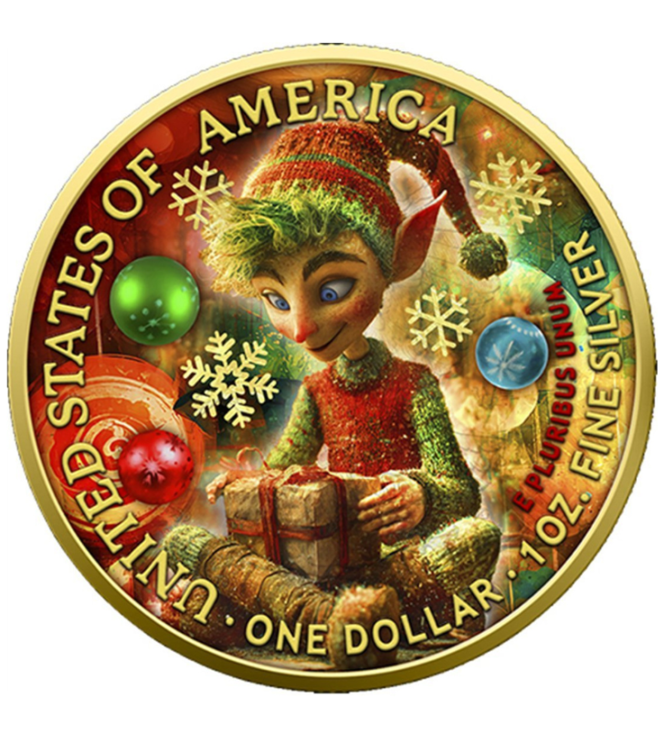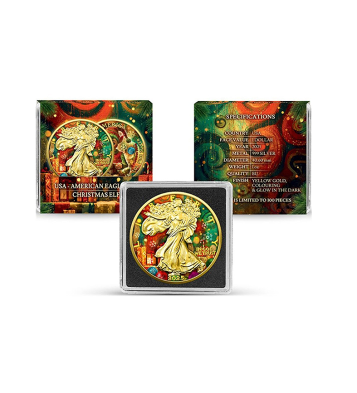 This classic, globally recognized silver coin has been given a delightful new holiday twist with two festive designs: the Nutcracker and the Elf. The double-sided coloring brings warmth and cheerful character to each piece, while the gold-plated obverse and Glow-in-the-Dark effect make these coins literally light up the winter nights, transforming them into both collectible treasures and charming seasonal decorations.
