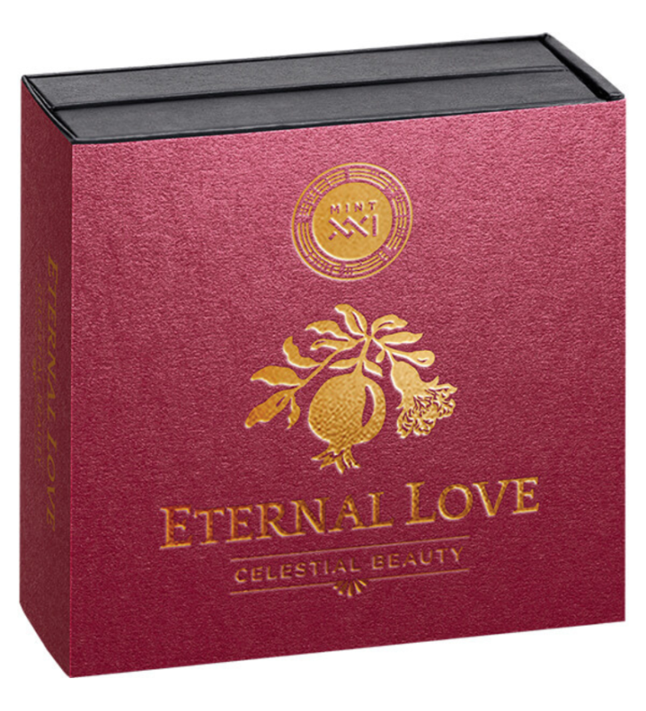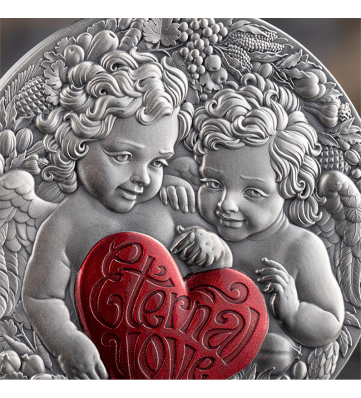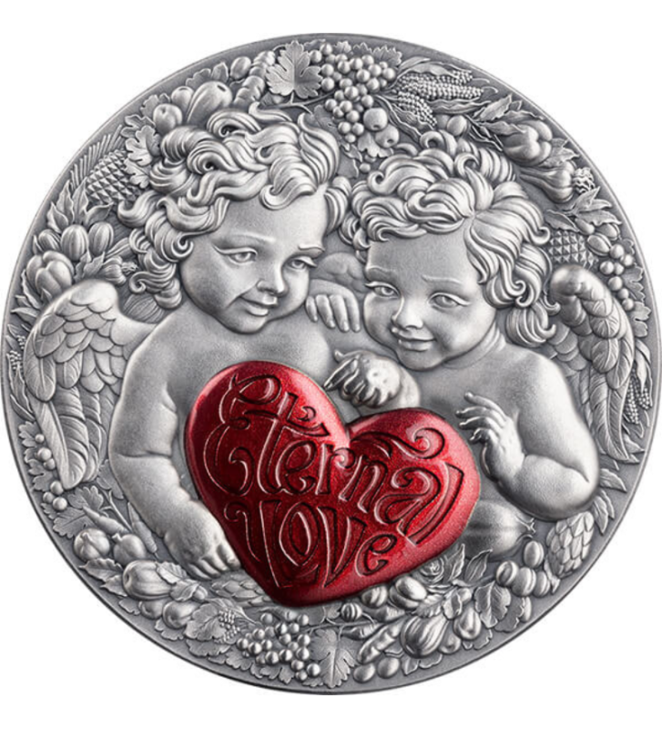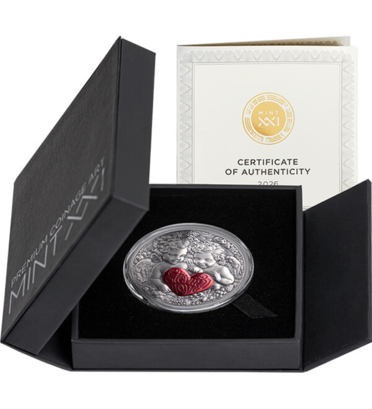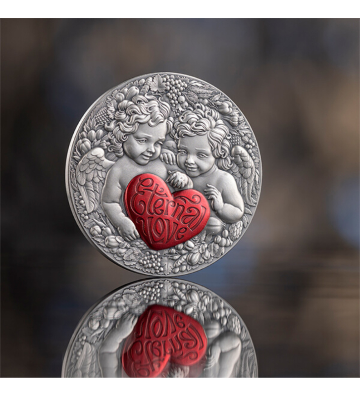 This graceful 1-ounce premium silver coin unveils a timeless allegory of devotion — two cupids united as a symbol of eternal love. Their tender embrace and radiant presence reflect the purity of emotion and the harmony of hearts bound together.