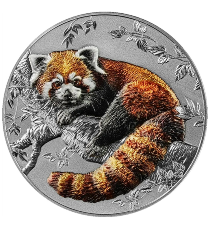 The coin depicts the red panda – a mammal inhabiting the mountain forests of the Himalayas and southern China. Also known as the „fire fox”, the animal is distinguished by its ringed bushy tail, soft reddish fur, and charming appearance. Despite its appeal, the red panda is an endangered species, and its presence has become a symbol of wildlife conservation efforts.