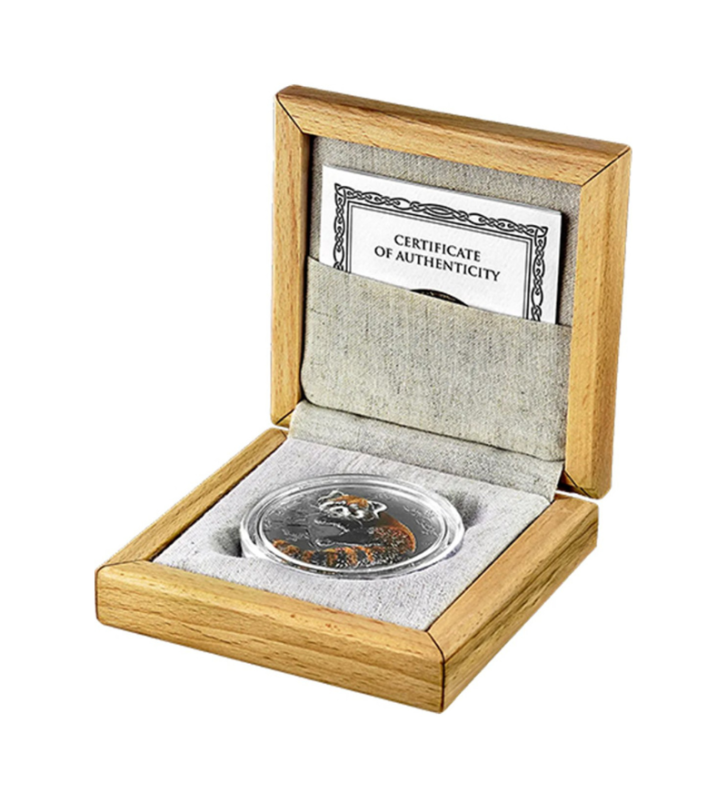 Niue Island 2025 – Red Panda 2 oz Silver HR is another coin in the „Representatives of the Species” series, showcasing extraordinary and rare animals from around the world. The series is created in cooperation between Mennica Polska and Germania Mint, and its distinctive feature is a unique, fully eco-friendly packaging made of cardboard, paper, wood, and linen.