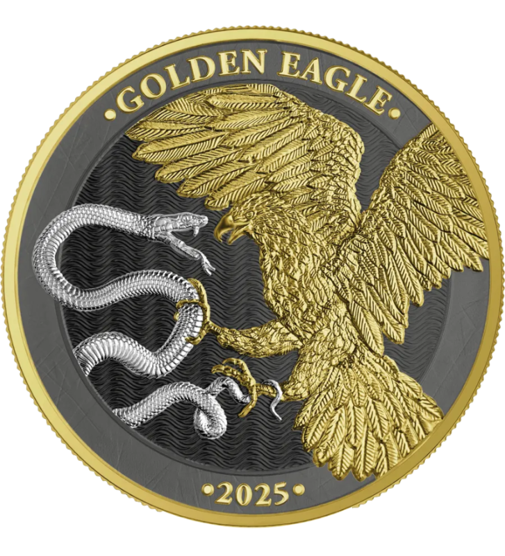 2025 Malta Golden Eagle 30 Euro 1 Kilo Silver BU has been enlarged and additionally enriched with ruthenium and gold to highlight more design details.
