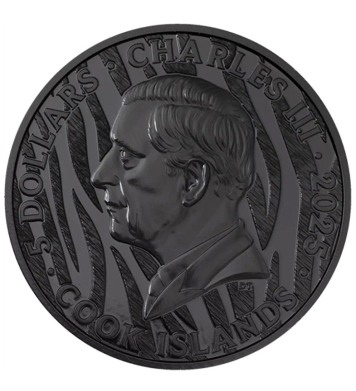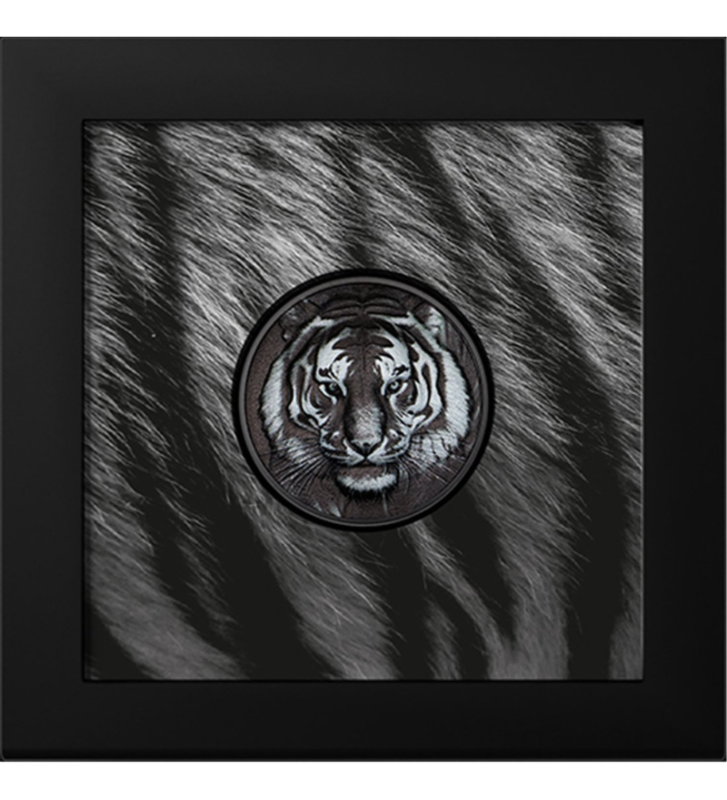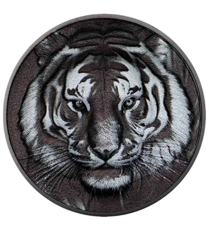 At the center of the coin is a fascinating portrait of a tiger, whose face is captured with flawless precision. The tiger’s distinctive stripes – symbols of camouflage and grace – are highlighted by the exclusive, deep black obsidian finish. The artfully applied white accents highlight the characteristic stripes and bring the portrait to life. Special attention is paid to the tiger's reflective eyes, which are both frightening and attractive. This effect gives the tiger a presence that captivates the viewer.