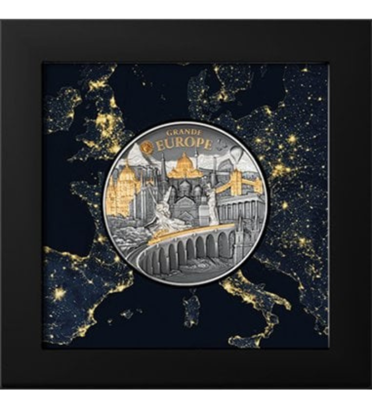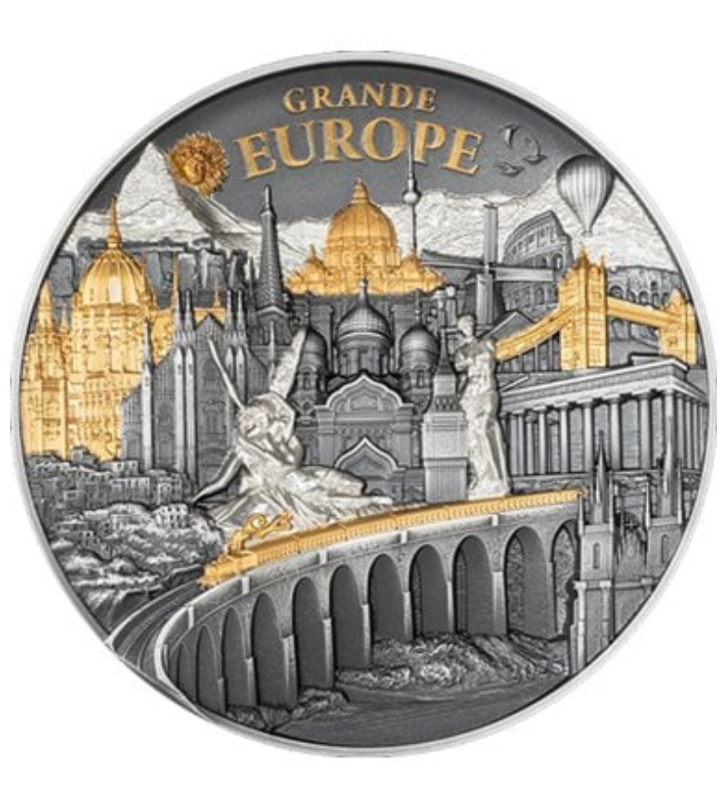 The coin features more than 20 European landmarks, masterfully designed in an antique finish with proof elements and elegant partial gold plating. The interplay of these finishes creates a vivid 3D effect that draws the viewer’s eye to new details again and again. Gold-plated accents highlight striking elements such as the gleaming domes and bridges, while the antique finish adds depth and texture to the remaining details.