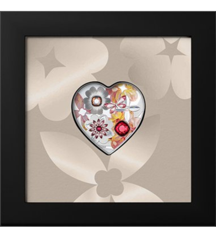 This extraordinary heart-shaped coin, struck in classic minting, combines artistic flair with modern design. Delicate graphic flowers blend with vibrant coloring, creating a lively motif that reflects the lightness and grace of nature.
