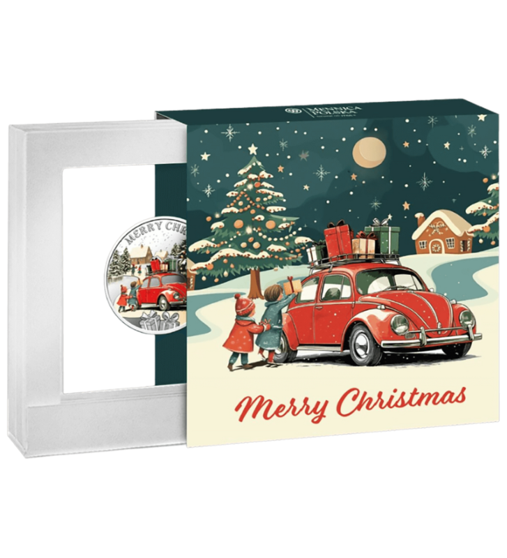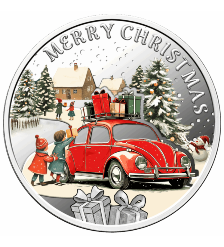 A red car filled with gifts, snow glistening in the lamplight, and children waiting impatiently for the celebration to begin — this coin takes you straight into a world where the magic of Christmas brings generations together.