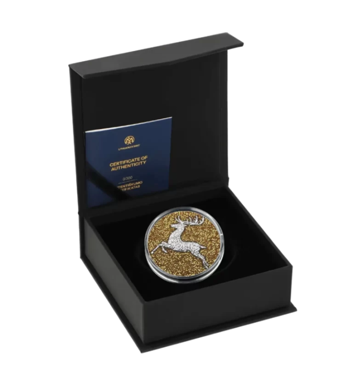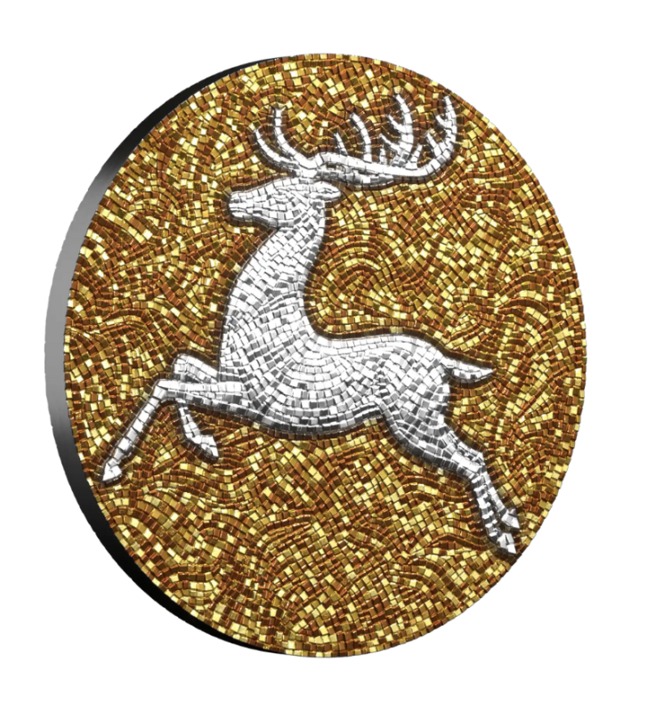 Each coin is struck from pure silver using an exceptional micro-engraving technique, where thousands of tiny circles capture and reflect light, creating the illusion of motion across the stag’s no
