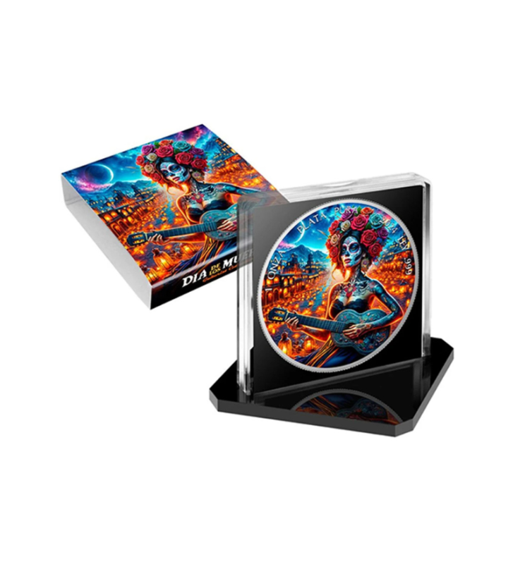 This beautiful 1 Oz Silver coin is dedicated to GUITARIST Dia De Los Muertos Libertad.