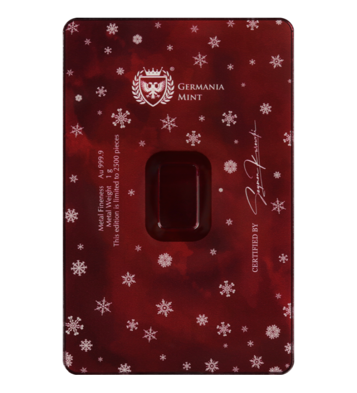 Sztabka o wadze 1 grama czystego złota próby 999,9 zachwyca minimalistycznym designem i precyzyjnym wykończeniem. Na awersie widnieje logo Germania Mint, masa i próba kruszcu. Całość zamknięta jest w eleganckim, świątecznym opakowaniu Safepack z motywem Bożego Narodzenia, które chroni produkt i jednocześnie nadaje mu kolekcjonerski charakter. Dodatkowa folia ochronna zabezpiecza powierzchnię przed zarysowaniami – nie stanowi integralnej części produktu.