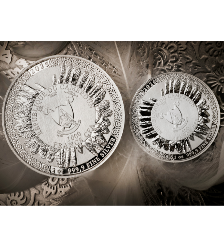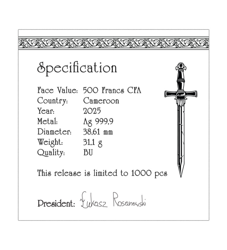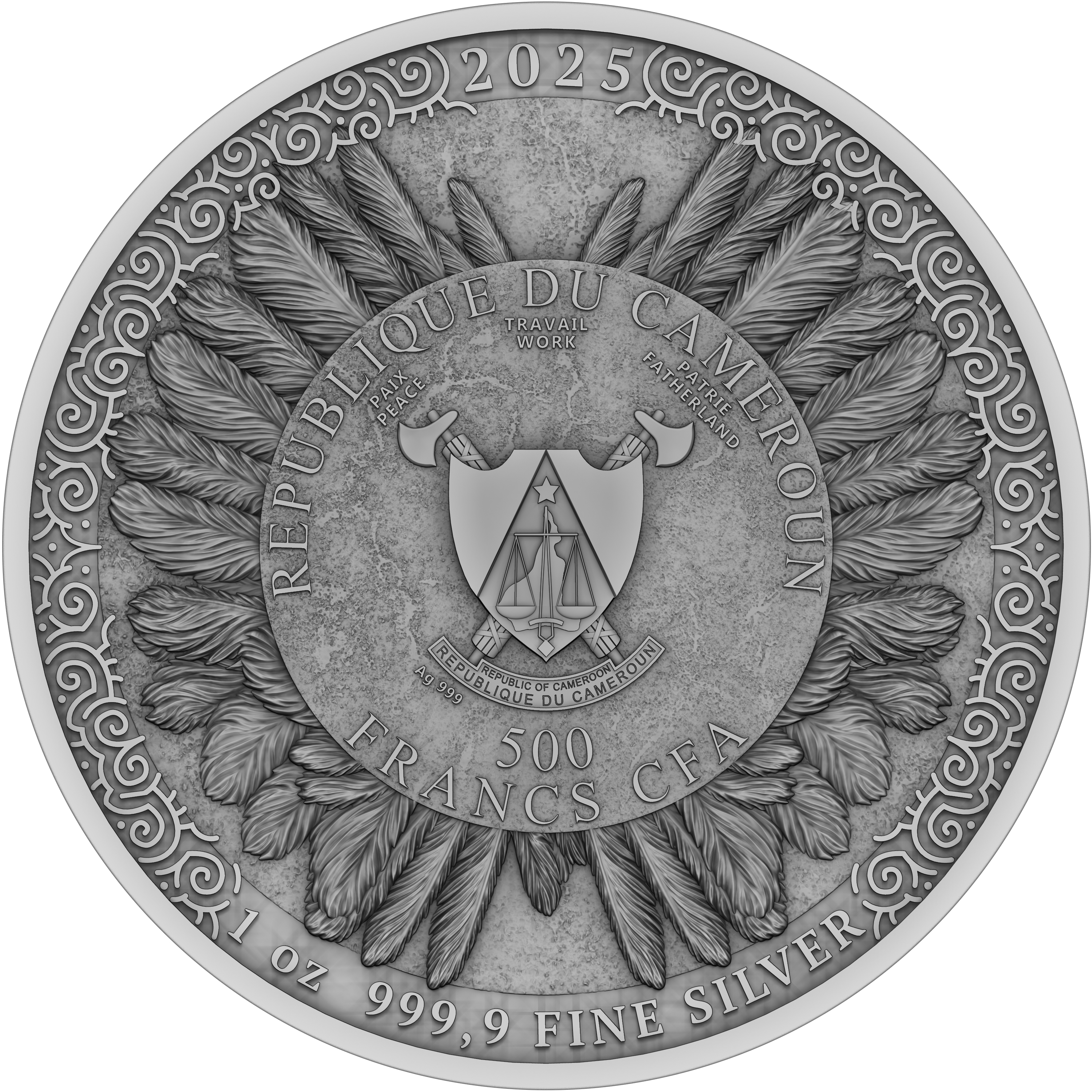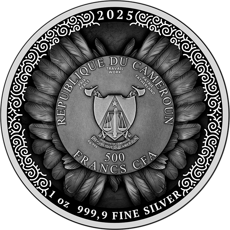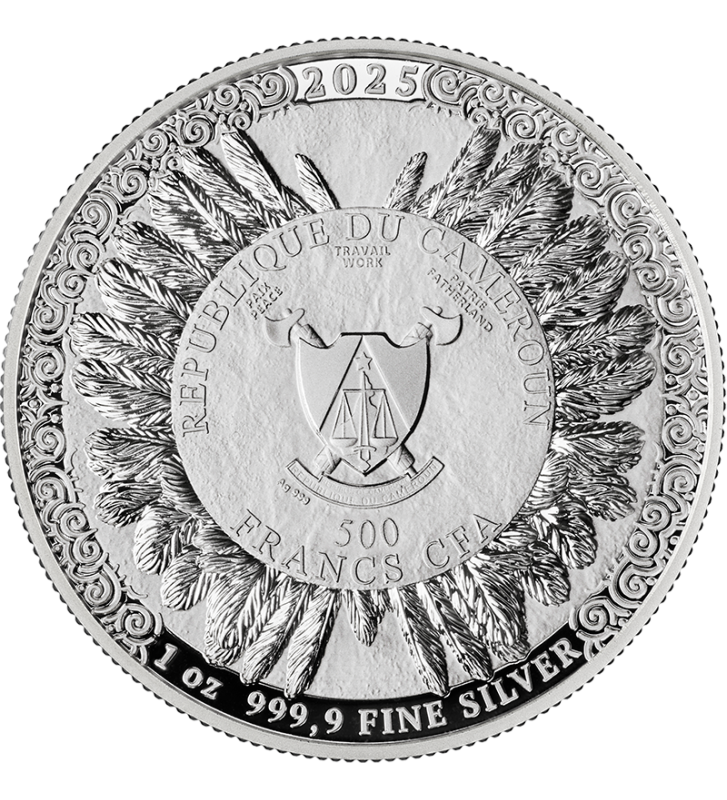 Centralnym punktem awersu jest herb Republiki Kamerunu – kraju emitującego monetę. Otacza go elegancka, ornamentalna kompozycja z ptasich piór, nawiązująca do ikonicznego hełmu Cahira. Tu również znajduje się informacja o wadze i kruszcu, podkreślająca prestiż kolekcjonerskiego srebra o czystości Ag 999,9.