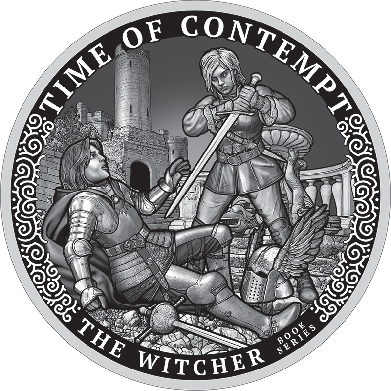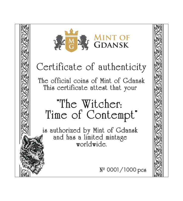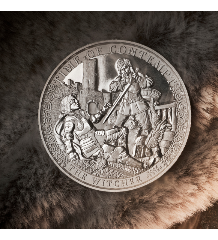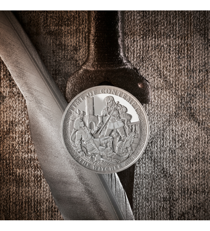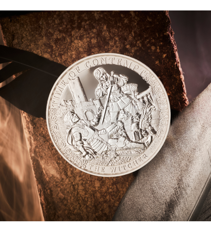 Tło monety przedstawia zarys zamku oraz elementy zniszczenia, które symbolizują narastający konflikt rozdzierający Kontynent. Subtelne ornamenty na obrzeżach przywołują kunszt dawnych rzemieślników i nadają kompozycji majestatycznego charakteru. W górnej części rewersu widnieje tytuł powieści – TIME OF CONTEMPT, a na dole dumnie błyszczy napis THE WITCHER.