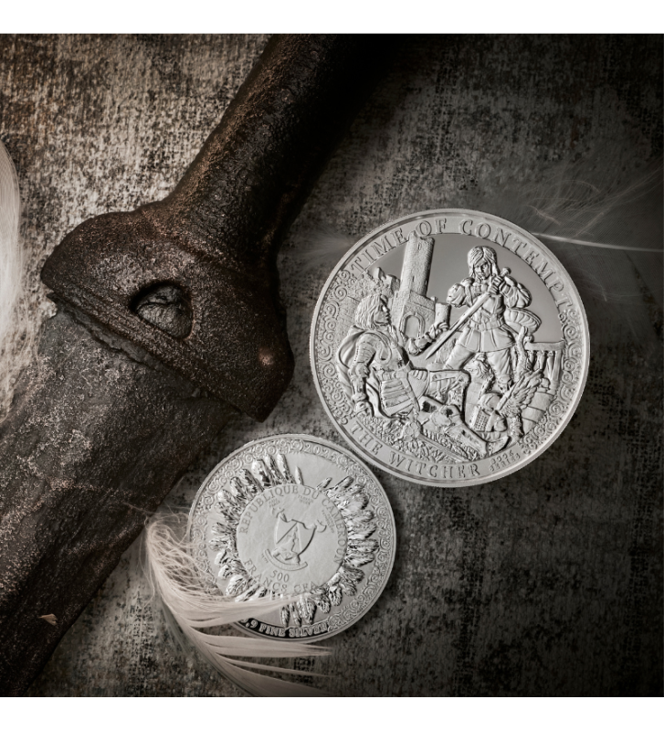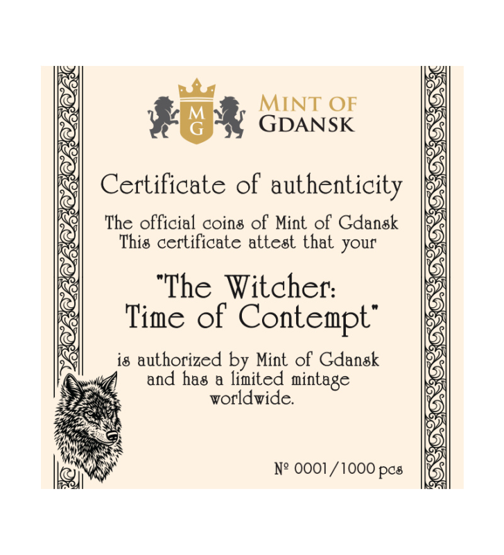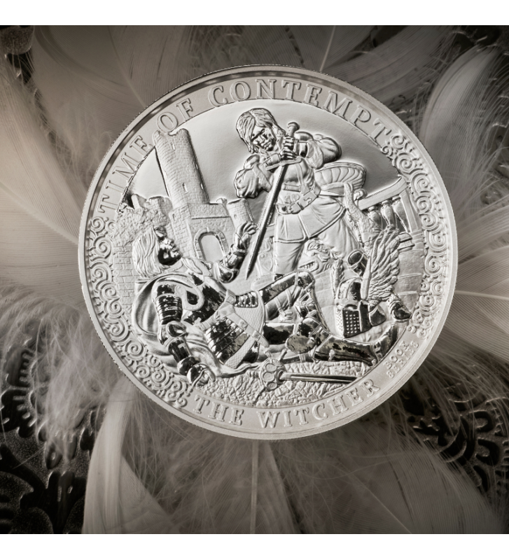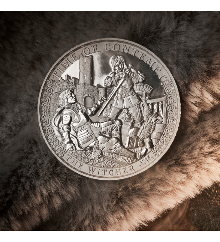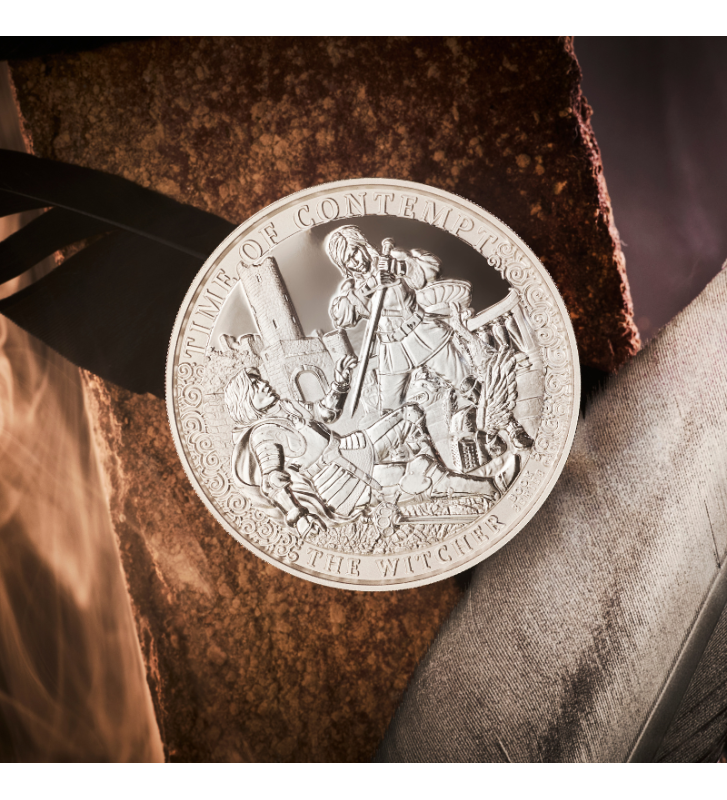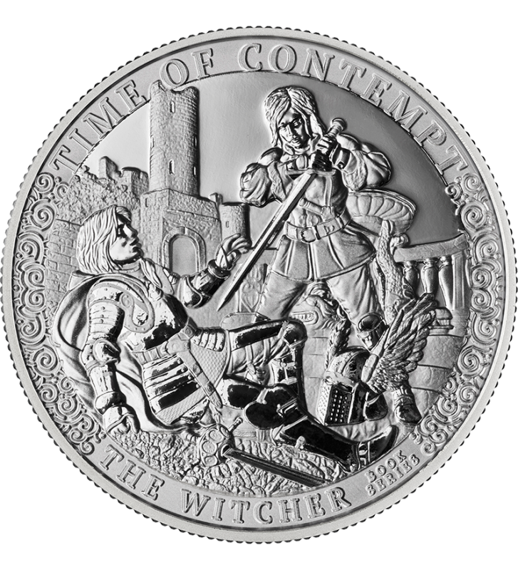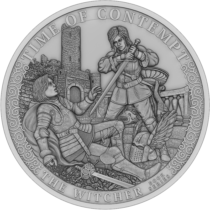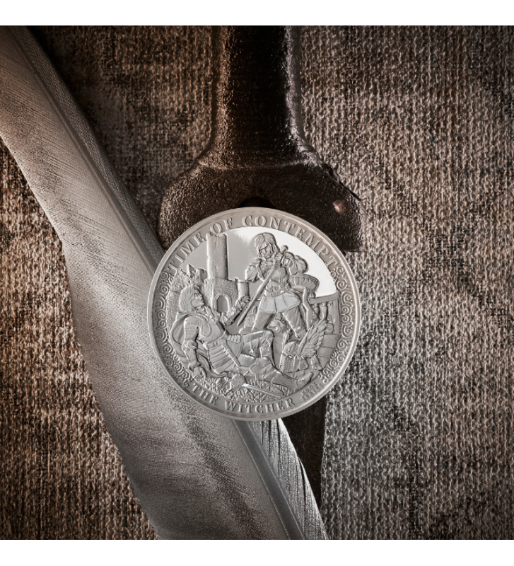 Tło monety przedstawia zarys zamku oraz elementy zniszczenia, które symbolizują narastający konflikt rozdzierający Kontynent. Subtelne ornamenty na obrzeżach przywołują kunszt dawnych rzemieślników i nadają kompozycji majestatycznego charakteru. W górnej części rewersu widnieje tytuł powieści – TIME OF CONTEMPT, a na dole dumnie błyszczy napis THE WITCHER.