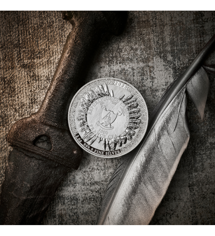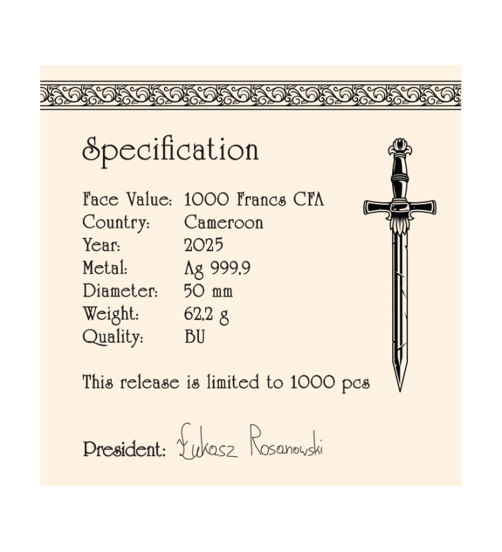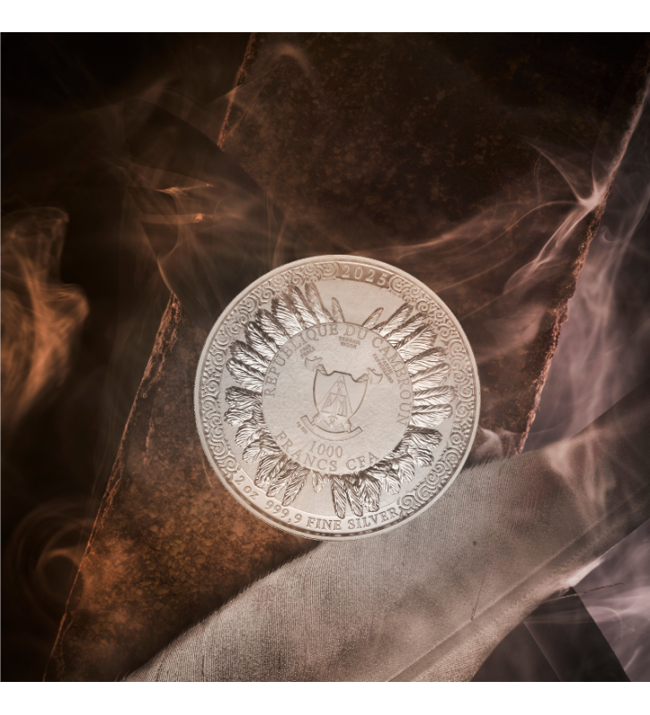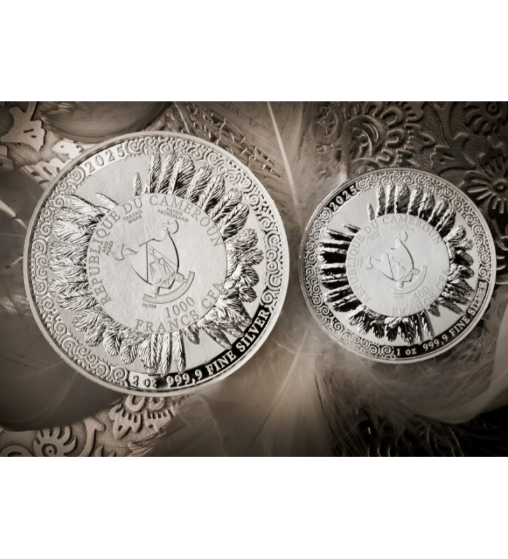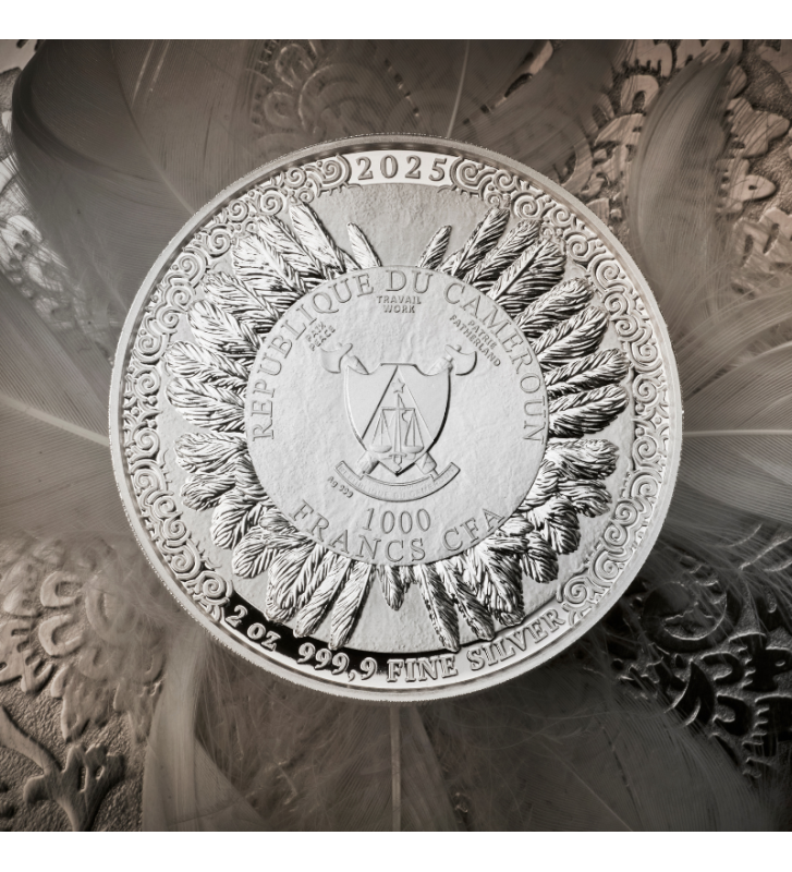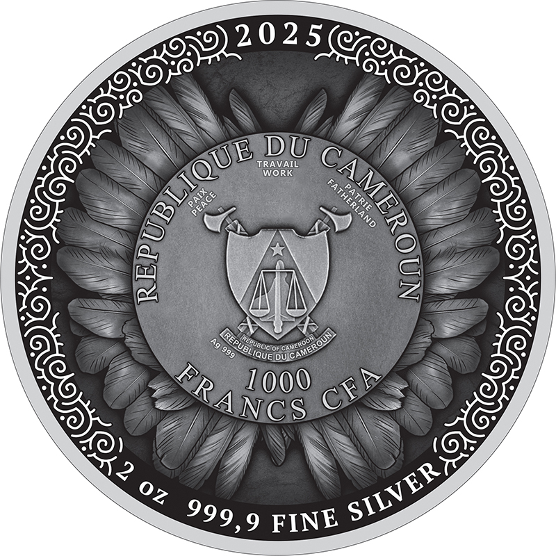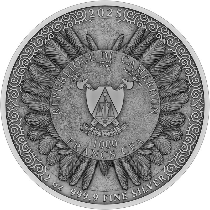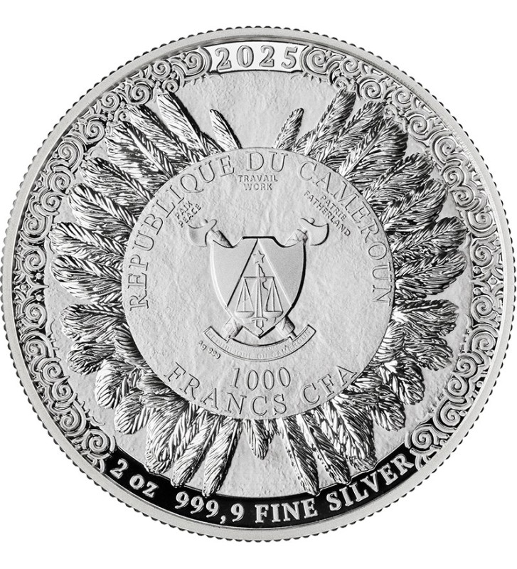 Centralnym punktem awersu jest herb Republiki Kamerunu – kraju emitującego monetę. Otacza go elegancka, ornamentalna kompozycja z ptasich piór, nawiązująca do ikonicznego hełmu Cahira. Tu również znajduje się informacja o wadze i kruszcu, podkreślająca prestiż kolekcjonerskiego srebra o czystości Ag 999,9.