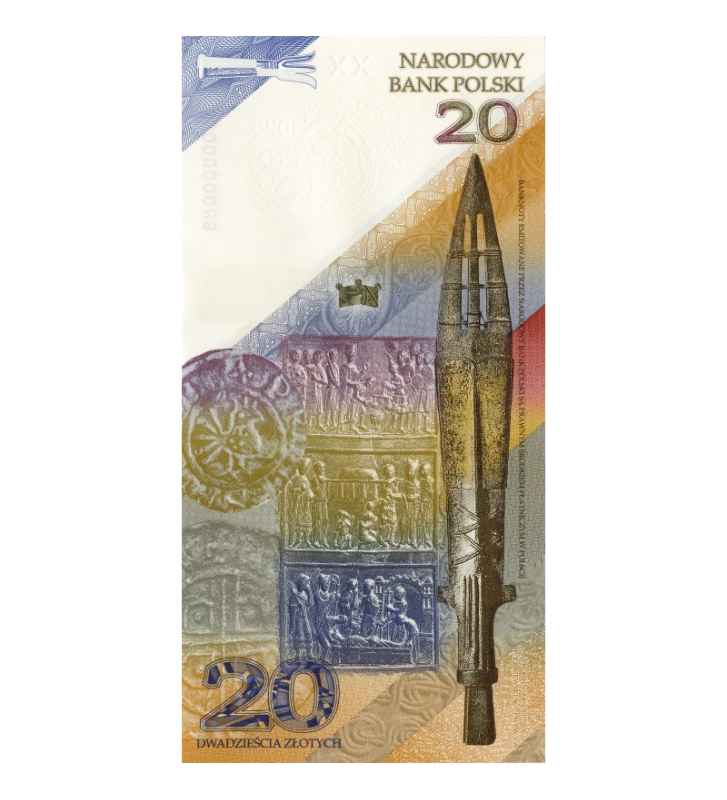 Stronę odwrotną banknotu zdobi włócznia św. Maurycego. To historyczne insygnium zostało wręczone Chrobremu przez Ottona III w 1000 r. jako symbol suwerenności polskiego władcy. Do naszych czasów zachował się jedynie grot włóczni.