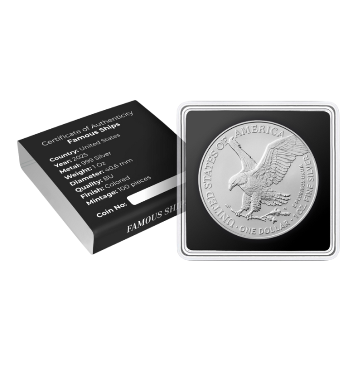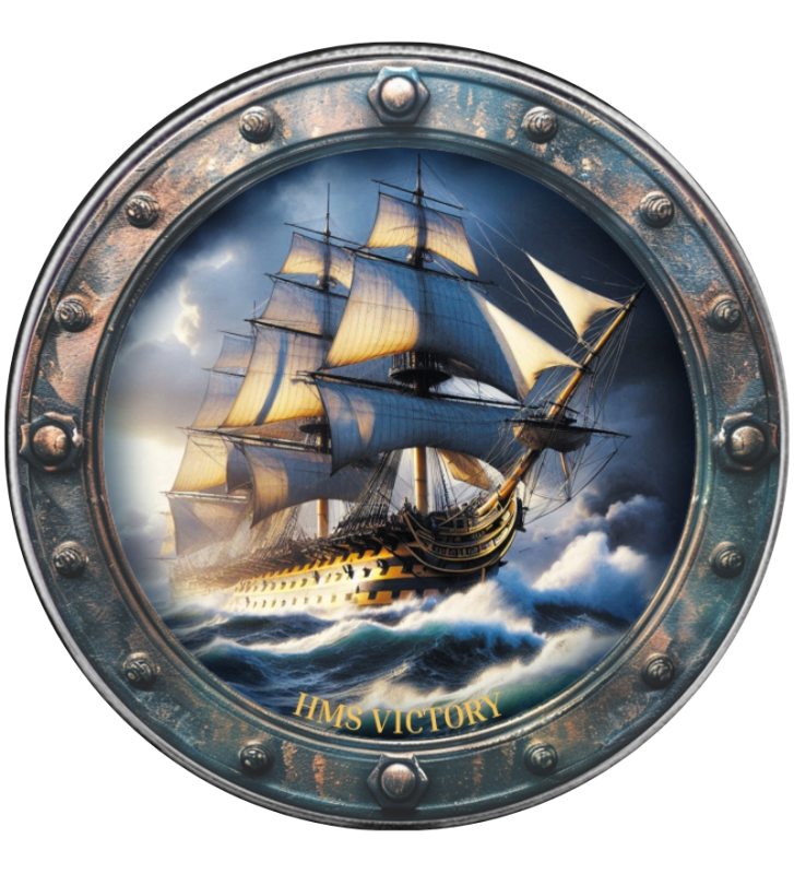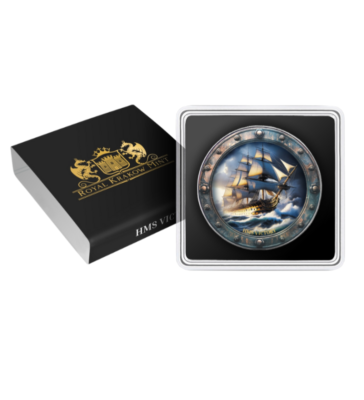 Ta piękna srebrna moneta o masie 1 uncji jest częścią serii „Famous Ships” i jest poświęcona HMS Victory .