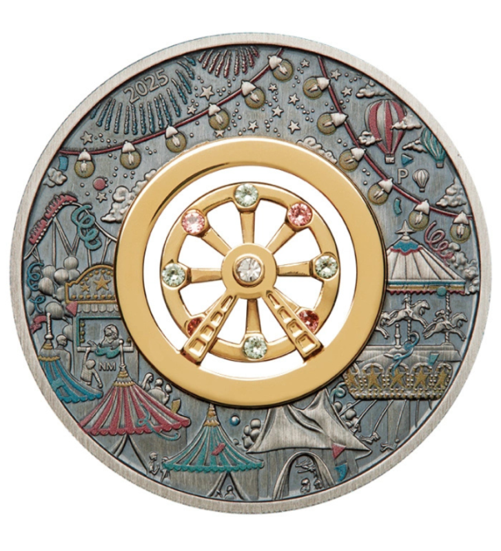 Ferris Wheel kolorowany 2 uncje Srebra 2025 Antiqued Coin to niezwykle efektowna moneta kolekcjonerska, której głównym elementem jest ruchoma miniatura diabelskiego młyna, ozdobiona kolorowymi kryształami Swarovskiego oraz pozłacaną ramą.
