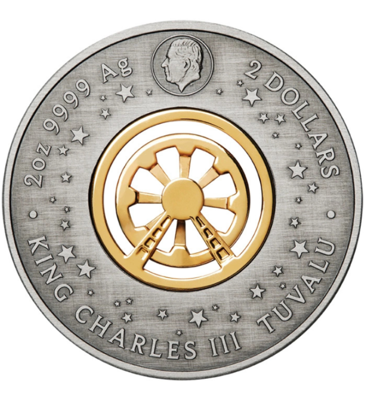Awers: W górnej części widoczny jest profil Jego Królewskiej Mości Karola III. W centralnym punkcie znajduje się realistyczna, tylna część Ferris Wheel, będąca integralną częścią mechanizmu obrotowego. W otoku umieszczono informacje o nominale (2 dolary tuwaluńskie), kraju emisji (Tuvalu), wadze (2 uncje) oraz czystości srebra (99,99%).