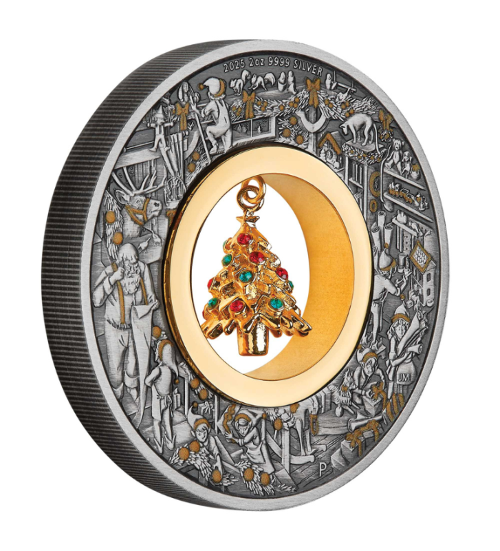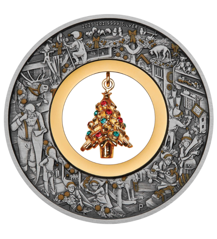 Warsztat Świętego Mikołaja 2025 – 2 oz Srebrna Moneta z Pozłacaną Choinką i Kryształkami Swarovskiego