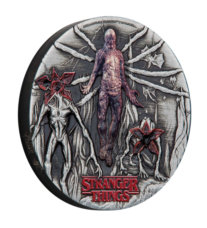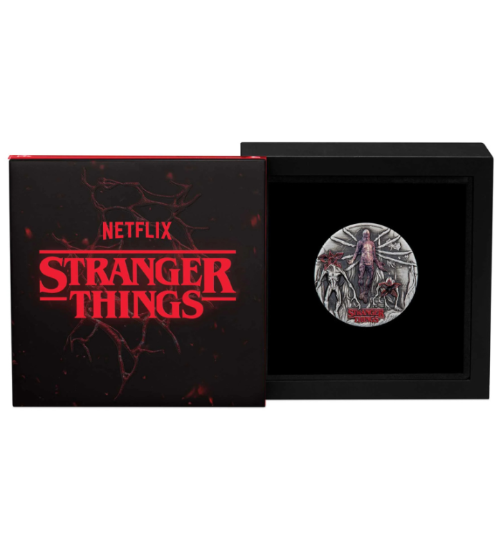 Moneta zaprezentowana jest w eleganckim czarnym drewnianym etui z czerwonymi akcentami. Na pokrywce znajdują się tłoczone detale oraz oficjalne logotypy Netflix i Stranger Things. Całość zapakowana jest w tematyczne pudełko transportowe, a do zestawu dołączono numerowany certyfikat autentyczności.