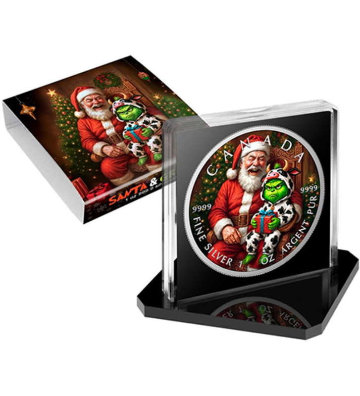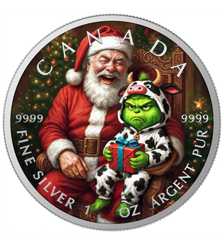 Ta piękna srebrna moneta o masie 1 uncji poświęcona jest Świętemu Mikołajowi i Grinchowi.