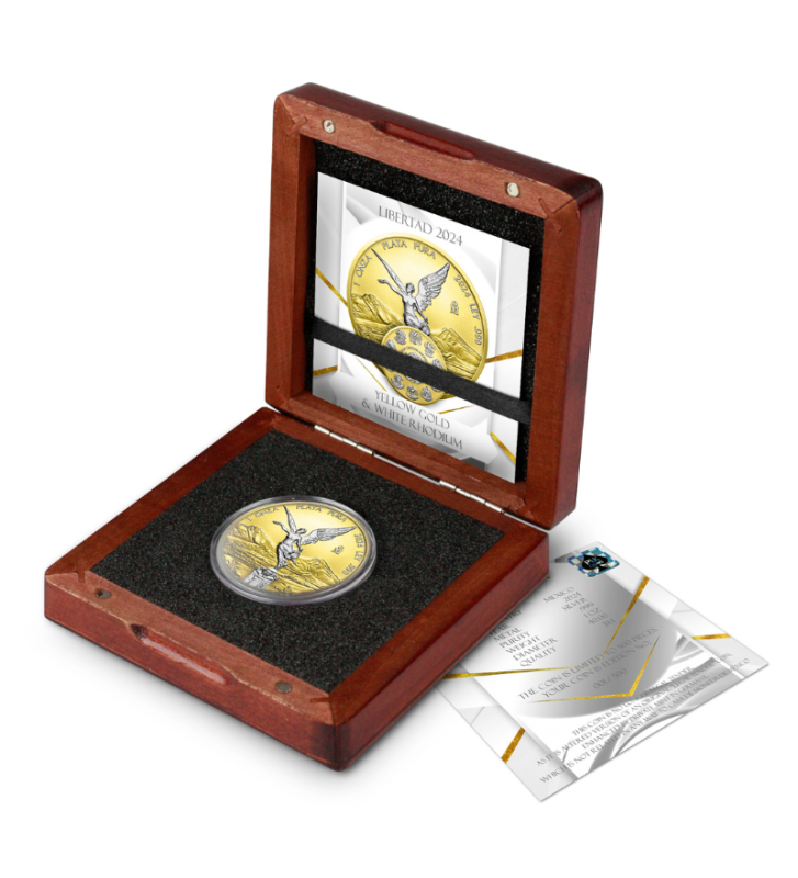 Moneta została uszlachetniona żółtym złotem i białym rodem. Jest dostarczana w drewnianym pudełku wraz z certyfikatem autentyczności.