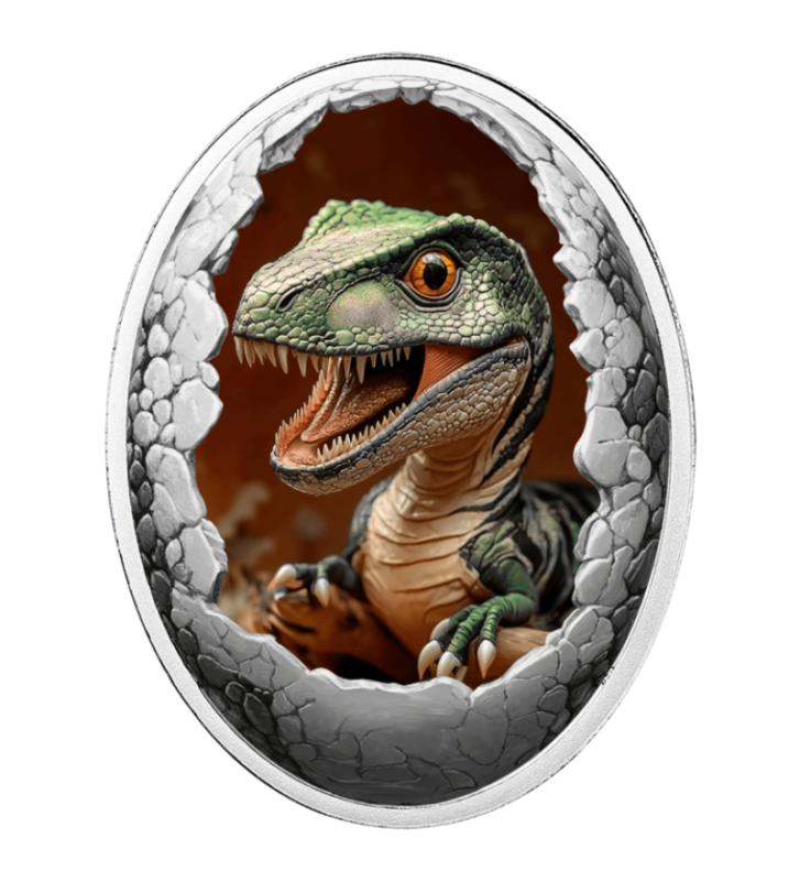 Każda z monet serii „Dinozaury” to unikalna scena wykluwania, ukazująca dinozaury w niesamowicie realistycznym efekcie 3D.