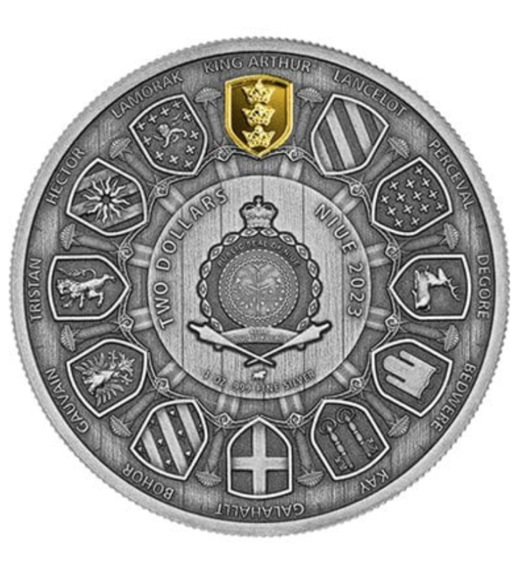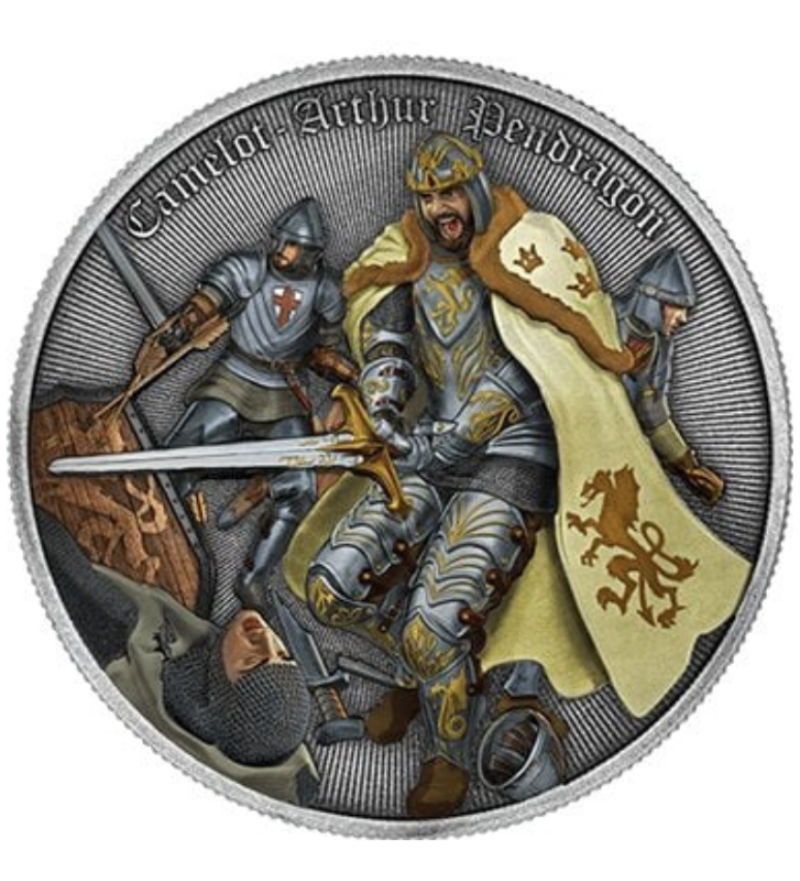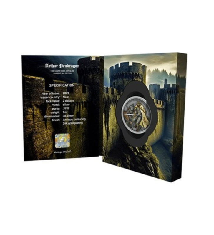 Wersja z antycznym wykończeniem bulionowej monety Arthur Pendragon to pierwsza moneta z antycznym wykończeniem w naszej serii Camelot BU Edition. Jest to bulionowa moneta premium będąca odpowiednikiem serii Camelot High Relief. Moneta ma ten sam projekt, lecz pozbawiony elementów tła, które mogłyby odwracać uwagę od głównej sceny.