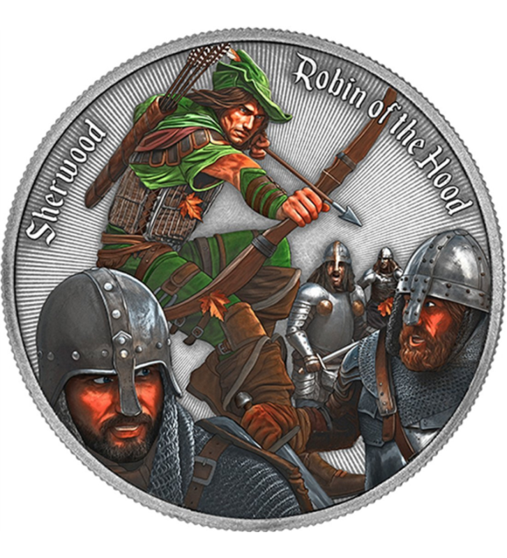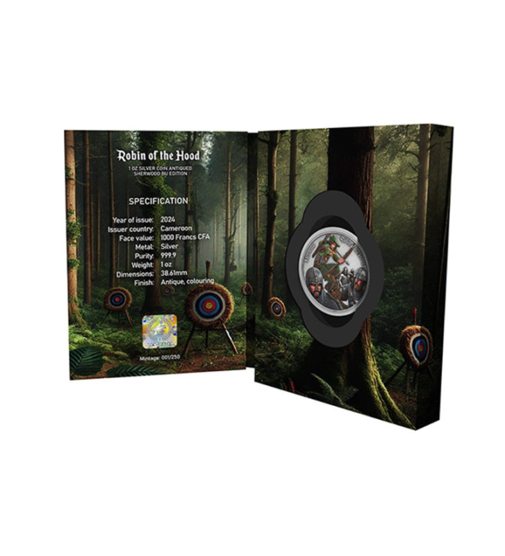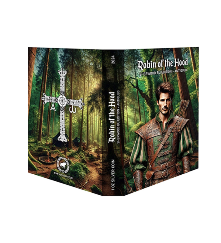 Wersja z antycznym wykończeniem bulionowej monety Robin of the Hood to pierwsze wydanie z naszej serii Sherwood BU Edition. Jest to bulionowa moneta premium, będąca odpowiednikiem serii Sherwood High Relief. Moneta posiada ten sam projekt, lecz pozbawiona jest elementów tła, które mogłyby odwracać uwagę od głównej sceny.