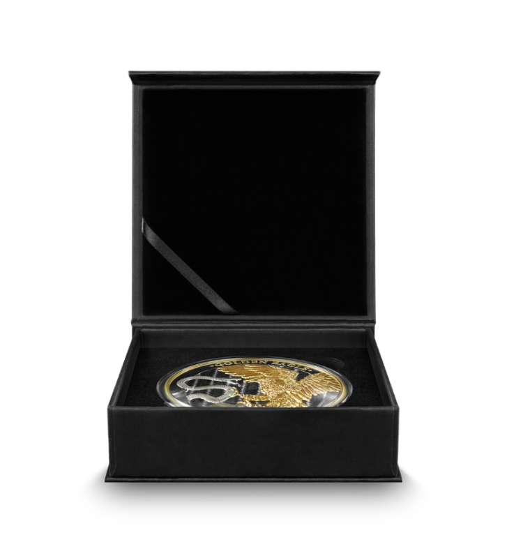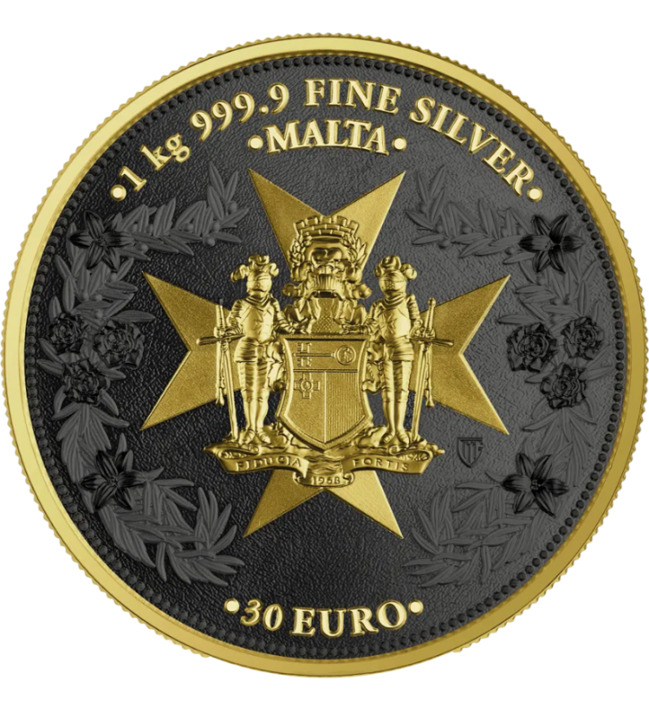2025 Malta Golden Eagle 30 Euro 1 Kilo Silver BU została powiększona, a dodatkowo wzbogacona rutenem i złotem, by wydobyć więcej detali designu.