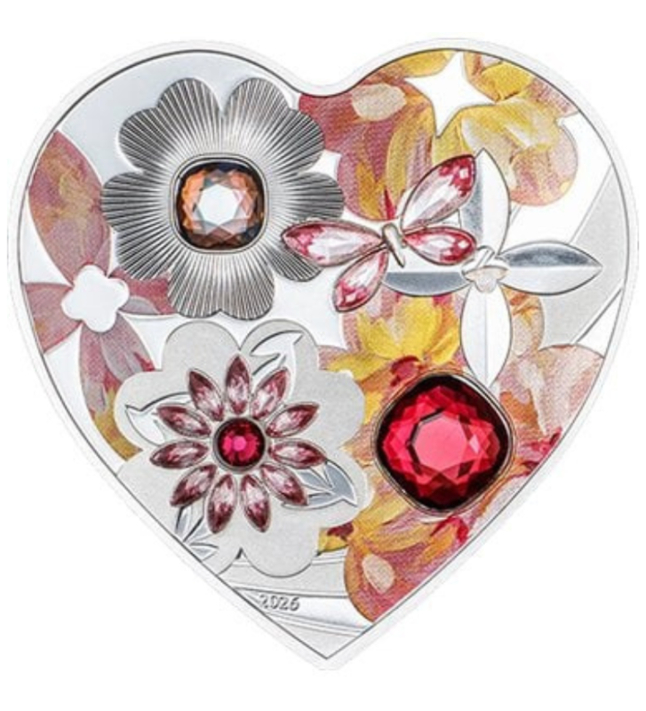 Trzy lśniące kryształy dodają monecie subtelnych akcentów, nadając jej wyjątkowy blask, podczas gdy tło w wykończeniu proof mistrzowsko podkreśla misternie wykonane detale. Połączenie motywów kwiatowych, stonowanej kolorystyki oraz eleganckich kryształów sprawia, że moneta Silver Hearts jest unikatowym prezentem na romantyczne i wyjątkowe okazje.