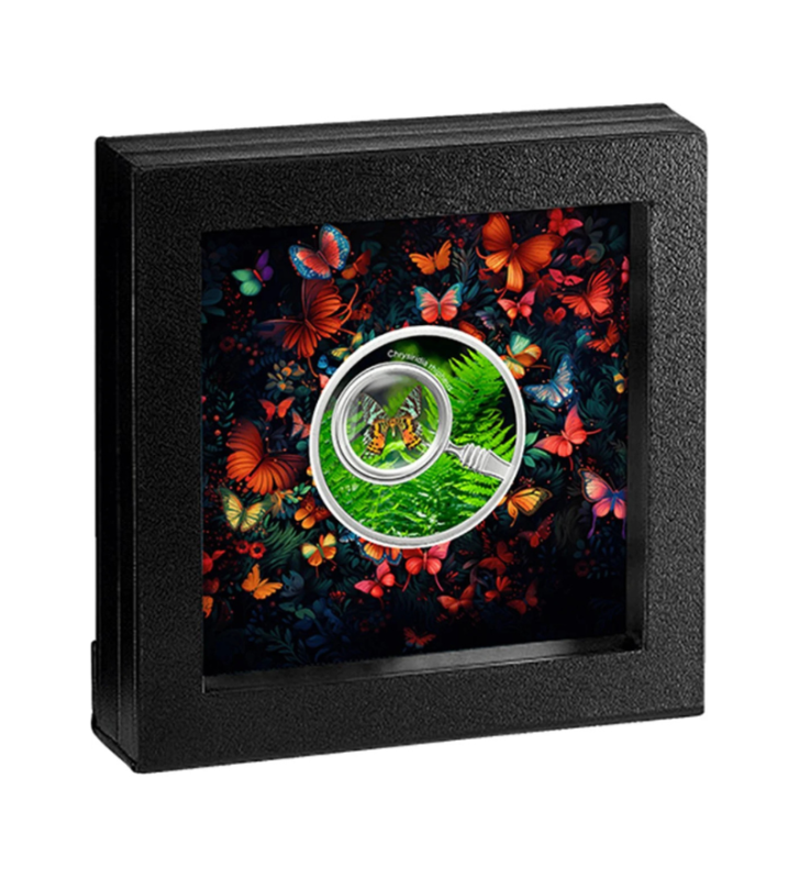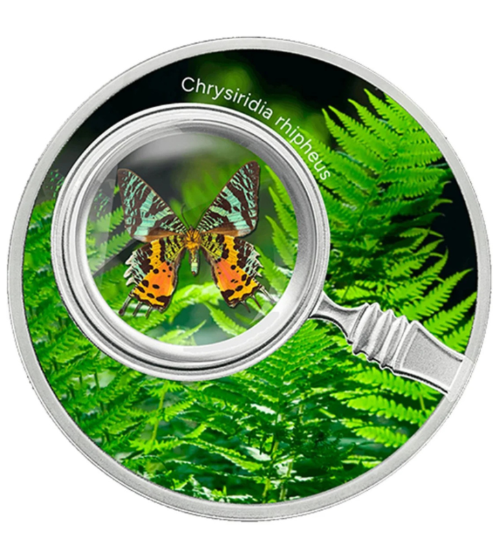 Ta piękna srebrna moneta o masie 17,5 g jest poświęcona motylom z gatunku CHRYSIRIDIA RHIPHEUS.
